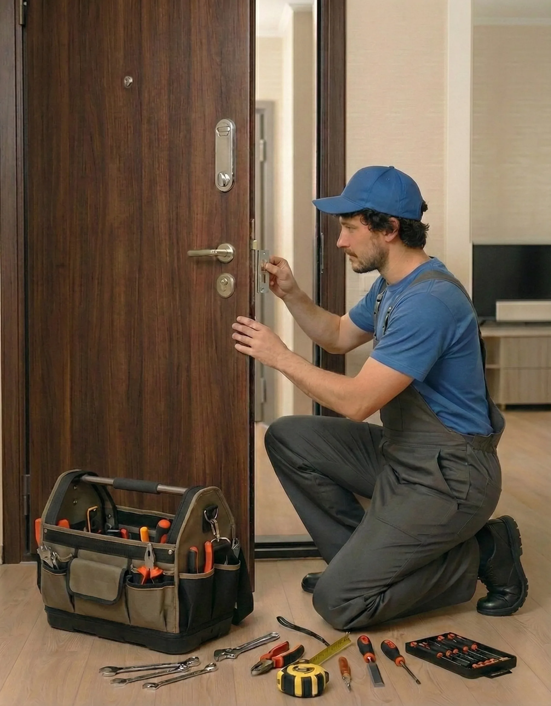 Весь необходимый инструмент и комплектующие с собой. Ремонтируем входные и межкомнатные двери любых конструкций — металлические, деревянные, пластиковые.